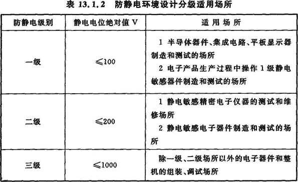 13.1.2 防靜電環(huán)境設(shè)計(jì)應(yīng)按電子產(chǎn)品或生產(chǎn)工序(設(shè)備)進(jìn)行分級(jí)。防靜電環(huán)境內(nèi)靜電電位絕對(duì)值應(yīng)小于電子產(chǎn)品的靜電電位安全值。防靜電環(huán)境設(shè)計(jì)應(yīng)分為三級(jí),防靜電環(huán)境設(shè)計(jì)分級(jí)適用場(chǎng)所應(yīng)符合表13.1.2的要求。