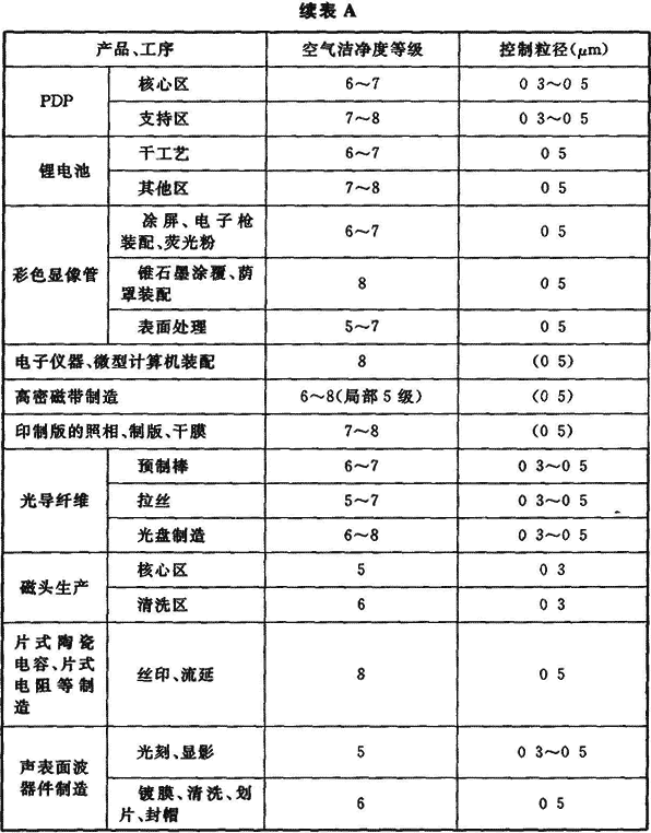 附錄A 各類電子產(chǎn)品生產(chǎn)對空氣潔凈度等級的要求