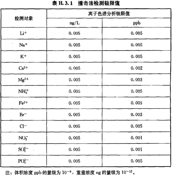 H.3.1 撞擊采樣法適用于檢測(cè)空氣中的陰陽離子(Li+、Na+、K+、Ca2+、Mg2+、Fe2+、Br-、Cl等)的濃度。檢測(cè)限值可按表H.3.1執(zhí)行。