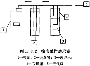 2 采樣瓶?jī)?nèi)注入30mL超純水,用管子按圖H.3.2所示將各部分連接起來。去濕管是為了保證沒有水滴被吸入采樣泵。