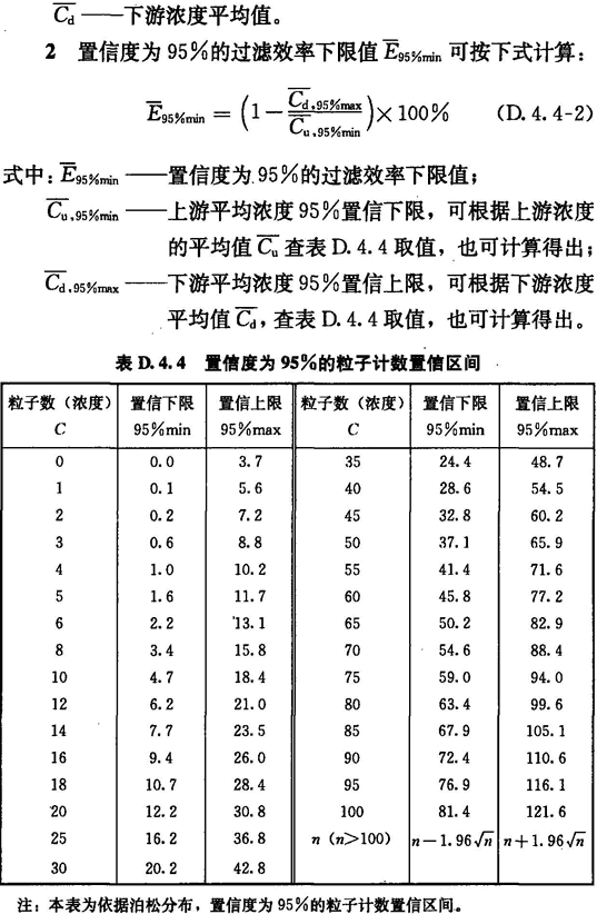 2 應(yīng)根據(jù)上游95%置信下限的粒子濃度Cu,95%min和過濾器最大允許透過率(0.01%),計(jì)算下游允許最大濃度,再根據(jù)表D.4.4查得或計(jì)算下游允許最大濃度的95%置信下限濃度Cd,95%min。