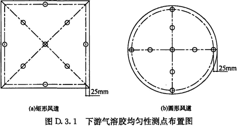 2 可在過濾器下游(或混勻裝置下游)適當(dāng)距離處,選擇一斷面,在該斷面上至少布置9個(gè)采樣管,采樣管為開口迎向氣流流動(dòng)方向的剛性金屬管,管徑應(yīng)盡量符合常規(guī)采樣儀器的等動(dòng)力采樣要求,其中5個(gè)采樣管在中心和對(duì)角線上均勻布置,4個(gè)采樣管分別布置于矩形風(fēng)道各邊中心、距風(fēng)道壁面25mm處(圖D.3.1a)。圓形風(fēng)道采樣管布置采用類似原則進(jìn)行(圖D.3.1b)。應(yīng)在氣溶膠發(fā)生器穩(wěn)定工作后(此時(shí)被測(cè)過濾器上游氣溶膠濃度至少應(yīng)為進(jìn)行效率測(cè)試試驗(yàn)時(shí)下限濃度的2倍以上),對(duì)每個(gè)測(cè)點(diǎn)依次進(jìn)行至少連續(xù)3次采樣,每次采樣時(shí)間不應(yīng)少于1min,并取其平均值作為該點(diǎn)的氣溶膠濃度檢測(cè)結(jié)果。當(dāng)所有9個(gè)測(cè)點(diǎn)的氣溶膠濃度測(cè)試結(jié)果與各測(cè)點(diǎn)測(cè)試結(jié)果算術(shù)平均值偏差均小于±20%時(shí),可認(rèn)為過濾器下游氣溶膠濃度均勻性滿足測(cè)試需要。