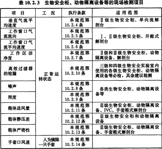 10.2.3 生物安全柜、動物隔離設備等的現場檢測項目應符合表10.2.3的要求,其中第1項~5項中有一項不合格的不應使用。對現場具備檢測條件的、從事高風險操作的生物安全柜和動物隔離設備應進行高效過濾器的檢漏,檢漏方法應按生物安全實驗室高效過濾器的檢漏方法執(zhí)行。