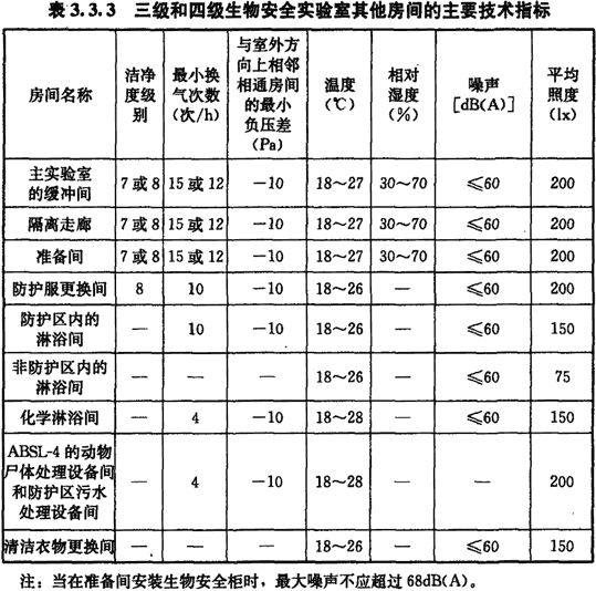 3.3.3 三級和四級生物安全實驗室其他房間的主要技術(shù)指標應(yīng)符合表3.3.3的規(guī)定。