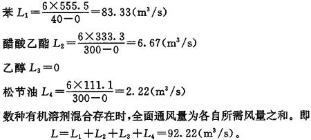 送風(fēng)空氣中上述四種溶劑的濃度為零,即y0=0。取安全系數(shù)K=6,分別計算得到各種溶劑蒸氣稀釋到最高允許濃度的所需風(fēng)量為:
